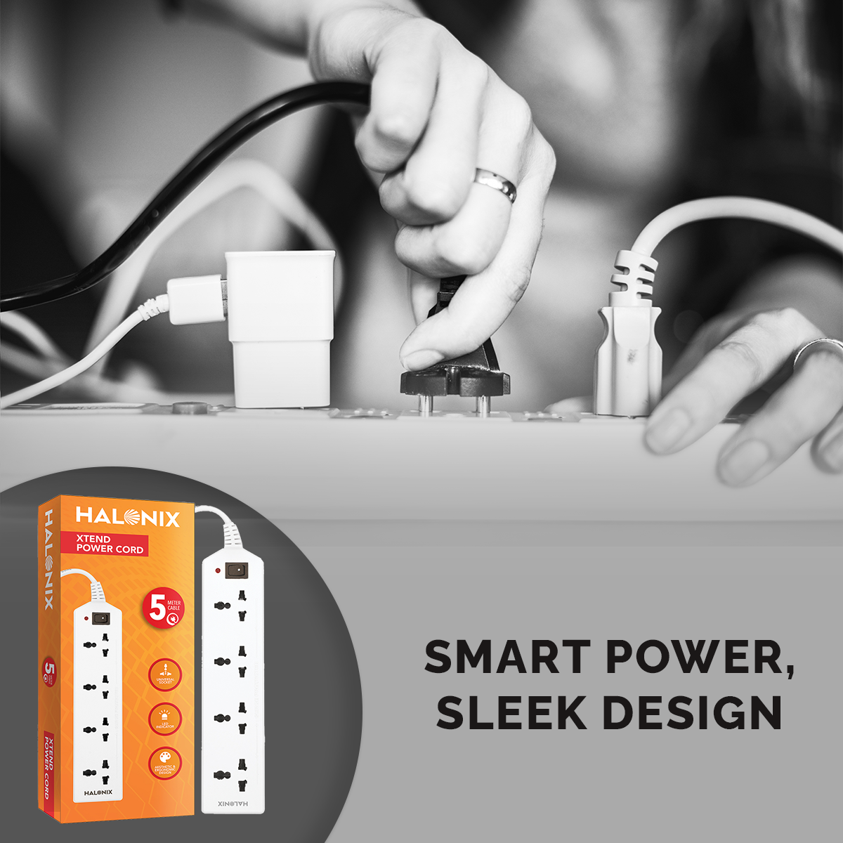 Xtend Power Cord is designed to bring versatility, safety and convenience to your everyday power needs with a 5-meter copper cable, On-Off switch, four 3-Pin universal socket, 6A rating is the perfect blend of functionality and sleek design for home, office or travel use.