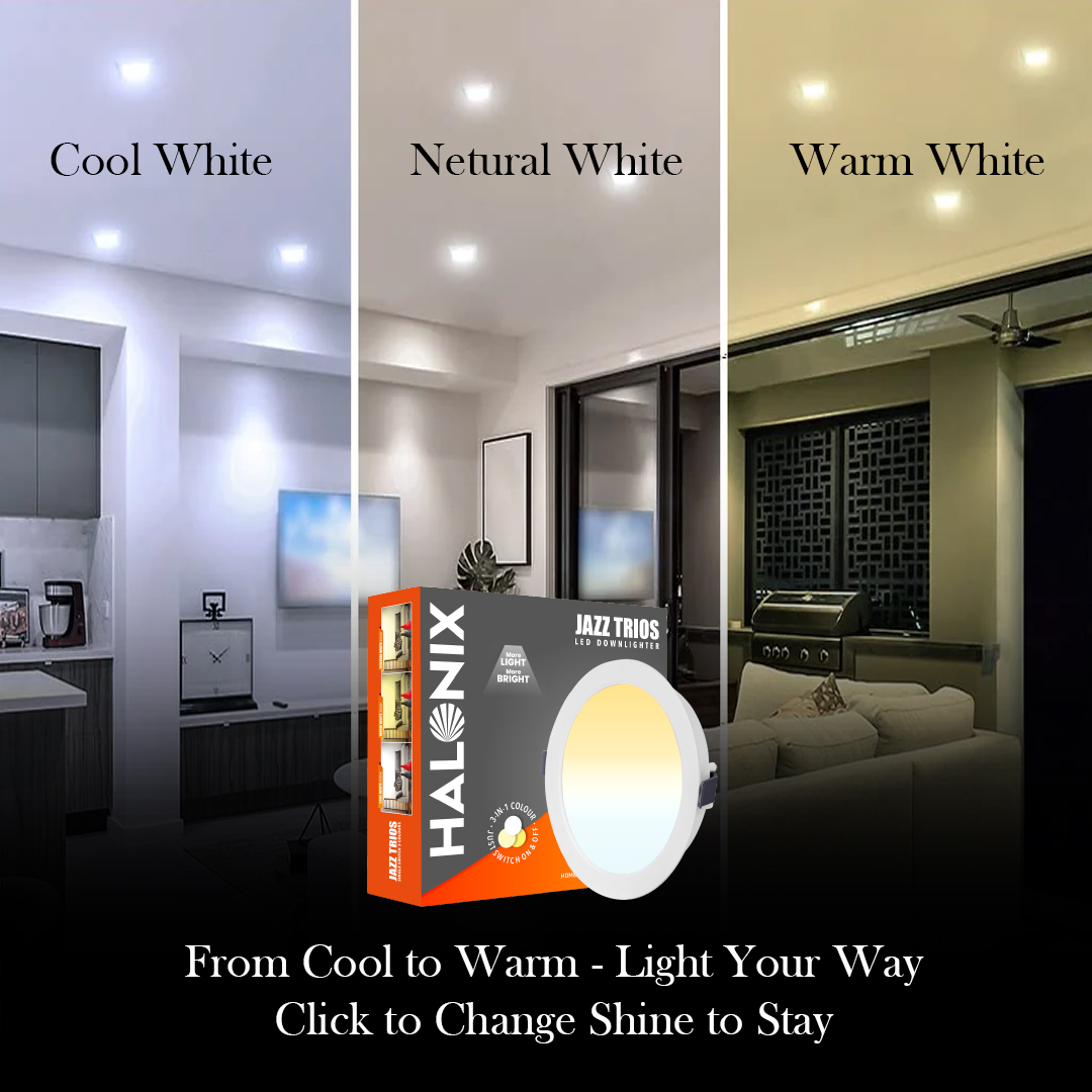 Jazz Trios LED Downlighter is a sleek, multi-colour recessed ceiling light designed for modern spaces. Made of durable polycarbonate, it offers 3-in-1 dimmable colour options—Cool White, Neutral White and Warm White— switchable with a simple On/Off action. With high brightness, energy efficiency and elegant design, it is perfect for homes, offices and shops.